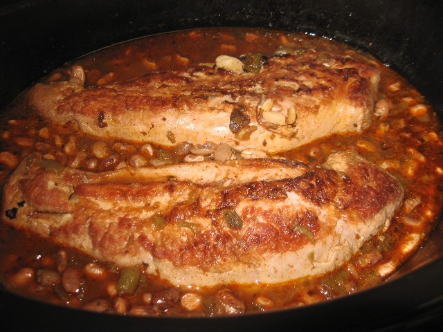 Brown the pork well and put it in the crock pot. Saute the onions and garlic in the same pan and then mix them with the DRY beans, spices, canned chilies then pour over the meat. Add just enough water to mostly cover the beans and meat, it should look like this: